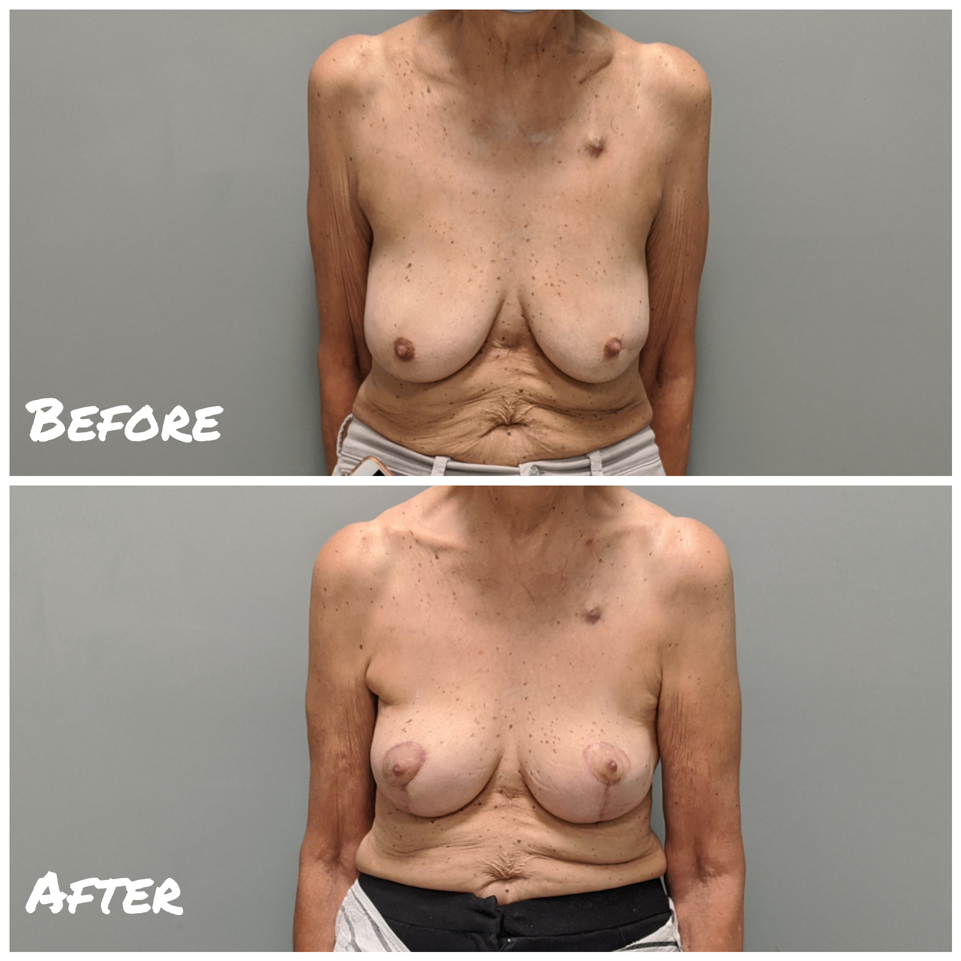 with a matching breast lift/reduction on the left side. Her chemotherapy port is still present on the left chest.